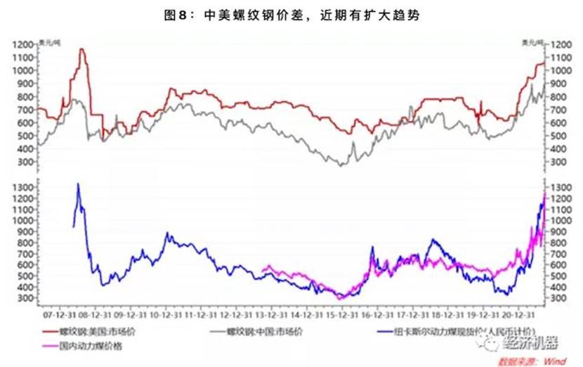 疫情。疫情對(duì)供給的沖擊體現(xiàn)在多個(gè)方面。一方面,由于供應(yīng)鏈的破壞,導(dǎo)致海外大宗商品漲幅比國內(nèi)更大,加劇了抑制大宗商品價(jià)格工作的難度,因?yàn)橐坏﹪鴥?nèi)打壓得厲害,企業(yè)就會(huì)通過出口進(jìn)行套利(圖8)。比如美國螺紋鋼價(jià)格超過了國內(nèi),而且價(jià)差有擴(kuò)大趨勢(shì);再比如,紐卡斯?fàn)杽?dòng)力煤價(jià)格超過180美元/噸,合人民幣突破1200/噸。另一方面,由于人流、物流和貨船短缺等限制,我國自海外進(jìn)口大宗商品也受到一定影響。比如1~8月份,我國從蒙古進(jìn)口動(dòng)力煤僅110萬噸,比去年同期下降20%,如果四季度不能如期出現(xiàn)放量,那么全年進(jìn)口將大幅下降(圖10)。