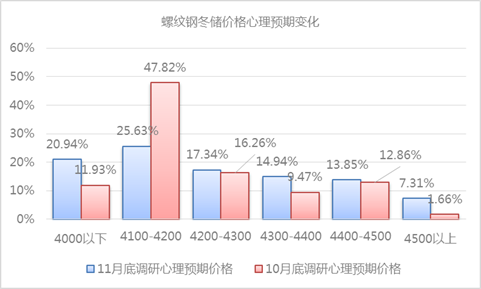 11月份隨著市場價(jià)格的下跌,市場冬儲(chǔ)心理出現(xiàn)了較為明顯的分化;雖然愿意價(jià)格在4100-4200之間進(jìn)行冬儲(chǔ)的人員仍占比最多為25.63%,但4000以下及4500以上愿意冬儲(chǔ)的占比較上次占比明顯增加,其中愿意4000以下進(jìn)行冬儲(chǔ)的較11月初調(diào)研增加9.01個(gè)百分點(diǎn),4500以上愿意冬儲(chǔ)的較11月初調(diào)研增5.65個(gè)百分點(diǎn)。