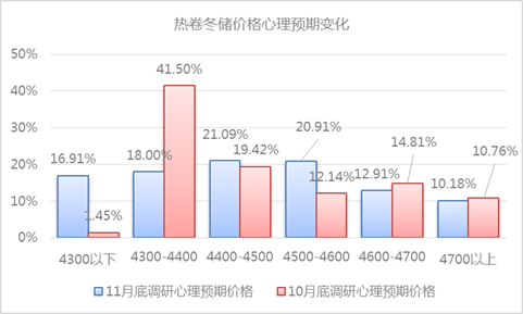 從本次調(diào)研數(shù)據(jù)看,熱卷市場商家冬儲(chǔ)心理預(yù)期價(jià)格更清晰,冬儲(chǔ)心理價(jià)位較上次調(diào)研價(jià)格心理價(jià)位上移100-200元/噸。