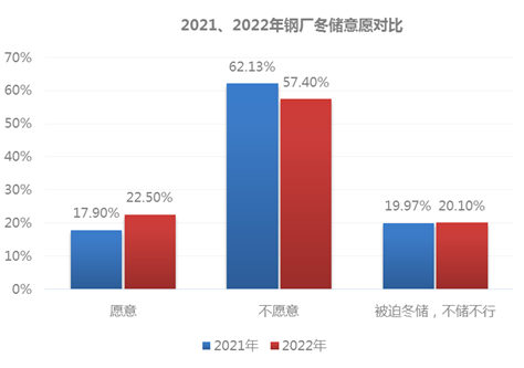 但從今年冬儲(chǔ)意愿和去年冬儲(chǔ)意愿比:2022年冬儲(chǔ)意愿較2021年冬儲(chǔ)意愿增加4.6個(gè)百分點(diǎn),不愿意冬儲(chǔ)意愿較去年下降4.73個(gè)百分點(diǎn),被迫冬儲(chǔ)的較去年增0.13個(gè)百分點(diǎn)。