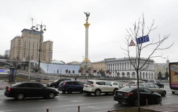 2月24日,車(chē)輛從烏克蘭基輔獨(dú)立廣場(chǎng)旁駛過(guò)