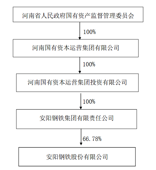 本次無償劃轉前,河南資本集團未直接持有安陽鋼鐵股票;通過其全資子公司、公司間接控股股東河南資本集團投資公司持有安陽鋼鐵人民幣普通股股份 1,918,308,486 股,占安陽鋼鐵股份總數的 66.78%。股權結構如下: