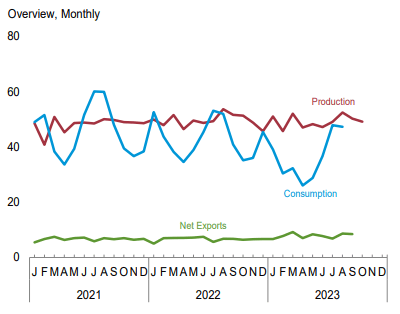 11月27日,美國能源信息署(EIA)發(fā)布最新《月度能源回顧》顯示,2023年10月份,美國煤炭產(chǎn)量為4907.4萬短噸(4451.92萬噸),較上年同期的5133.2萬短噸下降4.4%,較前一月的5020.3萬短噸下降2.25%。