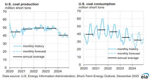 報(bào)告預(yù)計(jì),2024年美國(guó)煤炭產(chǎn)量將再次下降17.27%至4.86億短噸,同樣高于前一月預(yù)期值4.65億短噸。
