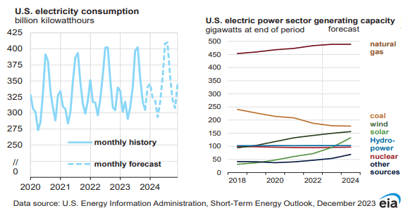 而隨著經濟增長加速,2024年,美國電力需求預計將再次增加至41030億千瓦時,低于前一月預期值41160億千瓦時。