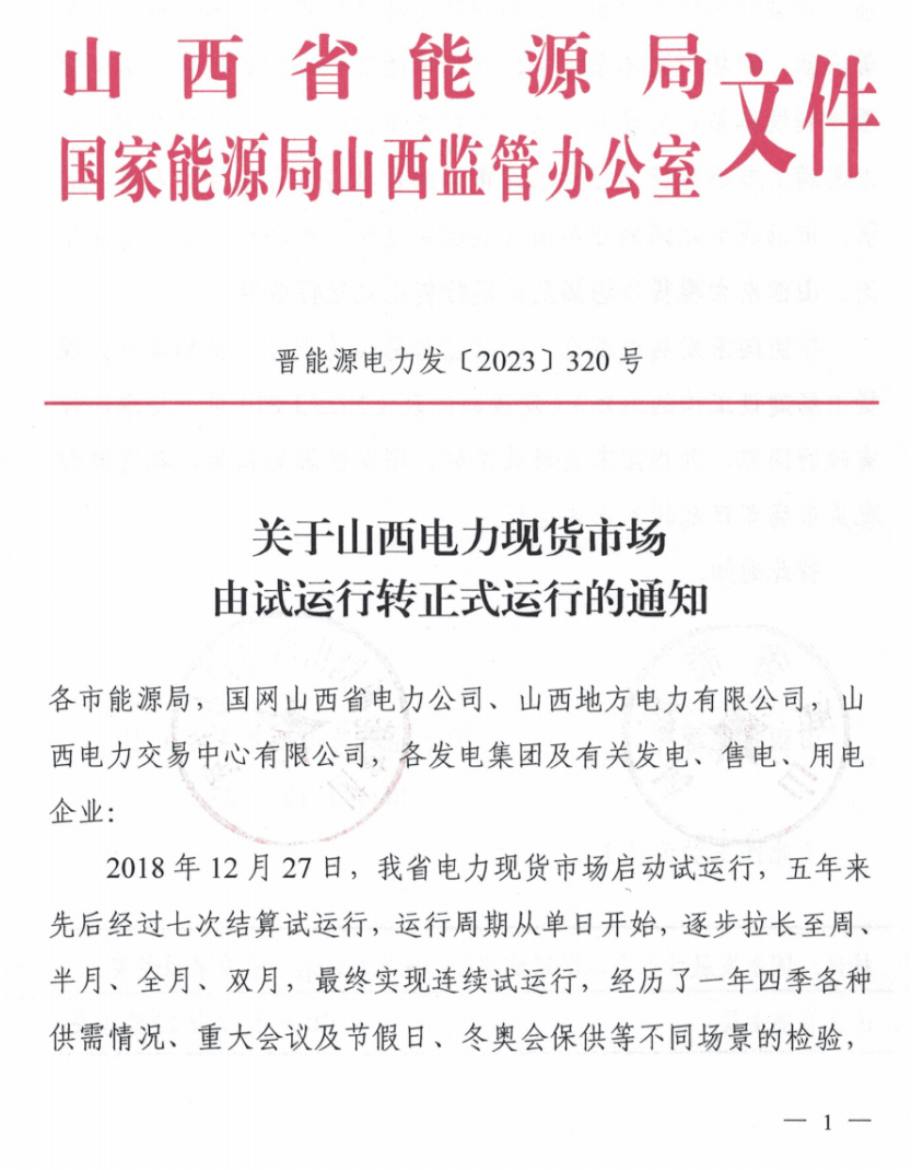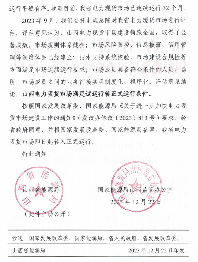 近日,山西省能源局、山西能監(jiān)辦發(fā)布《關(guān)于山西電力現(xiàn)貨市場由試運(yùn)行轉(zhuǎn)正式運(yùn)行的通知》(晉能源電力發(fā)[2023] 320號).通知稱,經(jīng)報請山西省政府同意,并報國家發(fā)展改革委、國家能源局備案同意,山西電力現(xiàn)貨市場自2023年12月22日起轉(zhuǎn)入正式運(yùn)行。標(biāo)志著山西省電力現(xiàn)貨市場由試運(yùn)行轉(zhuǎn)入正式運(yùn)行,成為我國第一個正式運(yùn)行的電力現(xiàn)貨市場。