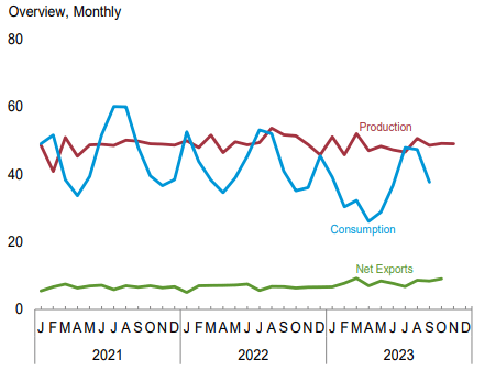 12月21日,美國(guó)能源信息署(EIA)發(fā)布最新《月度能源回顧》顯示,2023年11月份,美國(guó)煤炭產(chǎn)量為4895.1萬(wàn)短噸(4440.76萬(wàn)噸),較上年同期的4875.4萬(wàn)短噸微增0.4%,較前一月的4907.4萬(wàn)短噸下降0.25%。