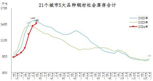 3月上旬,21個城市5大品種鋼材社會庫存1422萬噸,環(huán)比增加55萬噸,上升4.0%,庫存上升幅度回落;比年初增加693萬噸,上升95.1%;比上年同期增加97萬噸,上升7.3%。