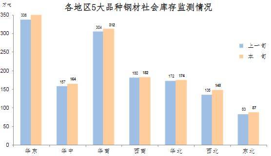 3月上旬,分地區(qū)來看,七大區(qū)域庫存環(huán)比繼續(xù)上升,具體情況為:華東庫存環(huán)比增加19萬噸,上升5.7%,為增量最大地區(qū);西北增加13萬噸,上升9.6%,為升幅最大地區(qū);華南增加8萬噸,上升2.6%;華中增加7萬噸,上升4.5%;東北增加4萬噸,上升4.8%;華北增加2萬噸,上升1.2%;西南增加2萬噸,上升1.1%。
