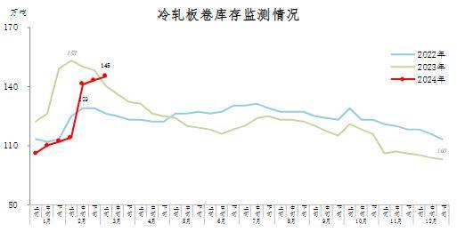 3月上旬,冷軋板卷庫存145萬噸,環(huán)比增加2萬噸,上升1.4%,庫存小幅上升;比年初增加42萬噸,上升40.8%;比上年同期增加5萬噸,上升3.6%。