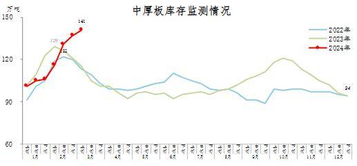 3月上旬,中厚板庫存141萬噸,環(huán)比增加4萬噸,上升2.9%,庫存連續(xù)上升;比年初增加47萬噸,上升50.0%;比上年同期增加26萬噸,上升22.6%。