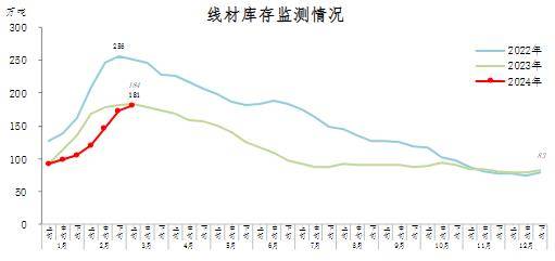 3月上旬,線材庫存181萬噸,環(huán)比增加8萬噸,上升4.6%,庫存上升幅度有所回落;比年初增加98萬噸,上升118.1%;比上年同期減少3萬噸,下降1.6%。
