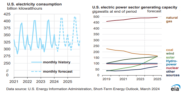 美國(guó)能源信息署(EIA)3月12日發(fā)布的最新《短期能源展望》報(bào)告顯示,2024年和2025年,美國(guó)電力消費(fèi)量預(yù)計(jì)將創(chuàng)歷史新高。