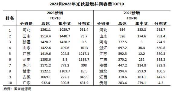 另外,去年位于新增第十四和第十八的云南、新疆一躍成為2023年的“榜眼”和“探花”。從細分數(shù)據(jù)可以看出,云南、新疆上榜的原因主要出于集中式光伏電站的大規(guī)模并網(wǎng),這得益于國家對大基地建設(shè)的政策推行。