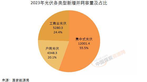 分結(jié)構(gòu)來看,集中式光伏電站12001.4萬千瓦,同比大增230.7%。分布式光伏9628.6萬千瓦,同比增長88.4%。而分布式光伏中戶用光伏達到4348.3萬千瓦,同比增長72.2%。2023年因大基地建設(shè)的推進,集中式光伏電站新增得到大幅提升,反超分布式,占比55.5%。在新增分布式光伏中,工商業(yè)分布式新增5280.3萬千瓦,占比24.4%,戶用布式則為4348.3萬千瓦,占比20.1%。