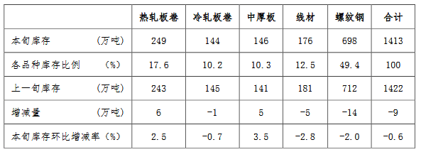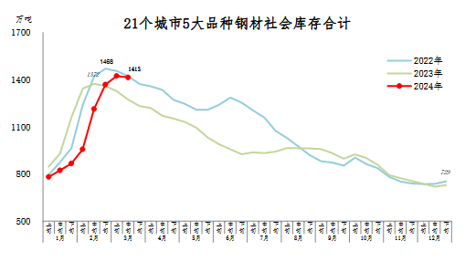 3月中旬,21個城市5大品種鋼材社會庫存1413萬噸,環(huán)比減少9萬噸,下降0.6%,庫存連續(xù)8旬上升后轉(zhuǎn)為下降;比年初增加684萬噸,上升93.8%;比上年同期增加141萬噸,上升11.1%。