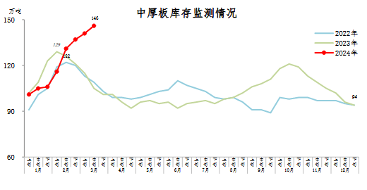 3月中旬,中厚板庫存146萬噸,環(huán)比增加5萬噸,上升3.5%,庫存增幅有所擴大;比年初增加52萬噸,上升55.3%;比上年同期增加41萬噸,大幅上升39.0%。