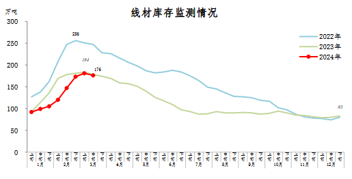 3月中旬,線材庫存176萬噸,環(huán)比減少5萬噸,下降2.8%,庫存由升轉(zhuǎn)降;比年初增加93萬噸,上升112.0%;比上年同期減少2萬噸,下降1.1%。