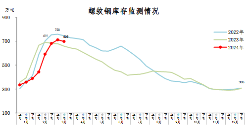 3月中旬,螺紋鋼庫存698萬噸,環(huán)比減少14萬噸,下降2.0%,庫存連續(xù)上升后轉(zhuǎn)為下降;比年初增加393萬噸,上升128.9%;比上年同期增加40萬噸,上升6.1%。