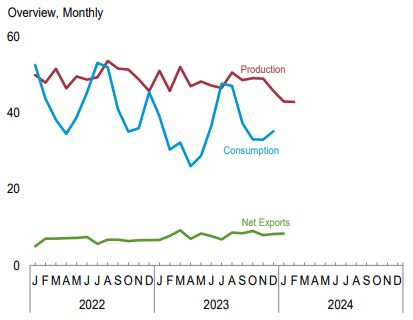 消費(fèi)方面,報(bào)告顯示,2023年12月份,美國煤炭總消費(fèi)量為3526.2萬短噸,同比下降22.32%,環(huán)比增長6.87%。