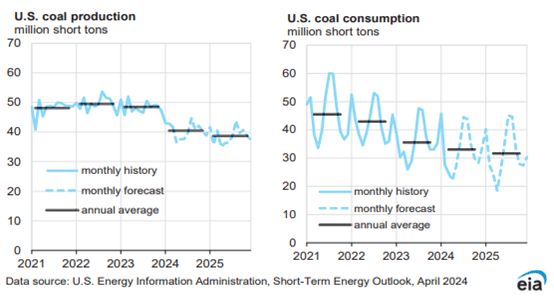 《短期能源展望》報(bào)告顯示,2024年,美國(guó)煤炭產(chǎn)量預(yù)計(jì)較2023年的5.816億短噸下降16.57%,至4.852億短噸。2025年產(chǎn)量繼續(xù)下降4.33%至4.642億短噸。