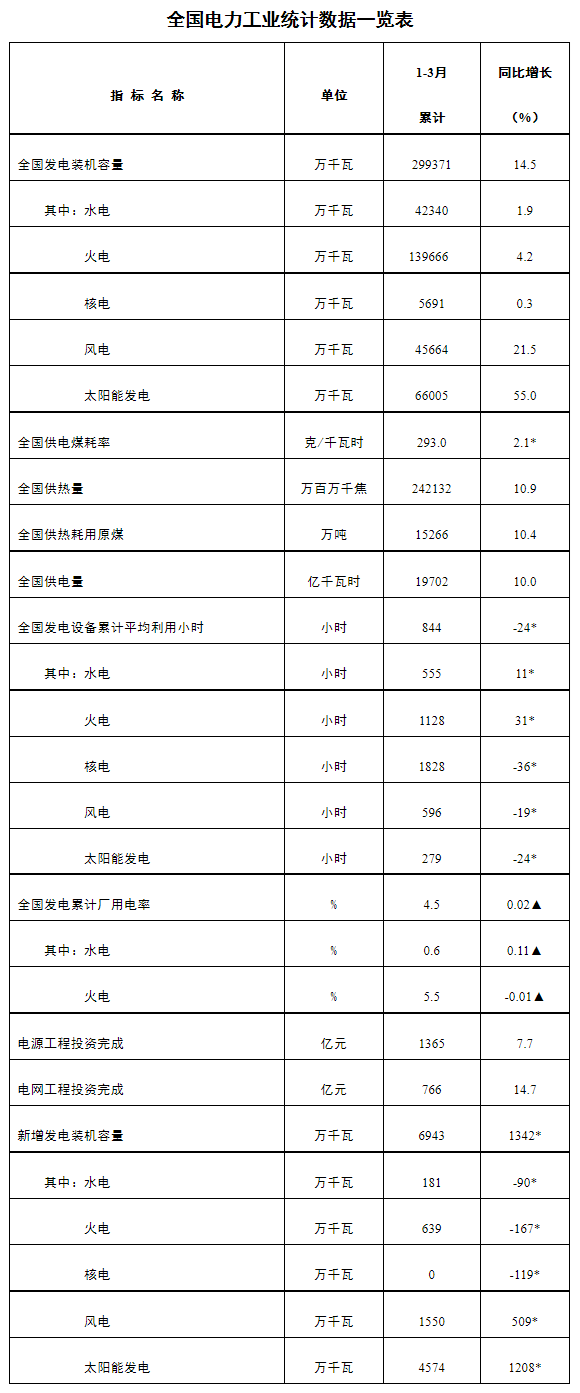 4月22日,國家能源局發(fā)布1-3月份全國電力工業(yè)統(tǒng)計數(shù)據(jù)。
