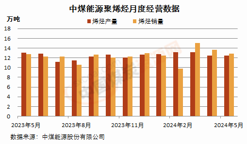 2024年5月份,中煤能源聚乙烯產(chǎn)量6.7萬(wàn)噸,同比下降1.5%,環(huán)比增長(zhǎng)4.7%;銷量6.8萬(wàn)噸,同比持平,環(huán)比下降4.2%。聚丙烯產(chǎn)量5.8萬(wàn)噸,同比下降7.9%,環(huán)比下降4.9%;銷量6.1萬(wàn)噸,同比增加1.7%,環(huán)比下降7.6%。