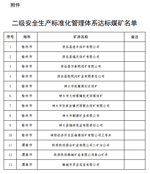 附件:二級(jí)安全生產(chǎn)標(biāo)準(zhǔn)化管理體系達(dá)標(biāo)煤礦名單