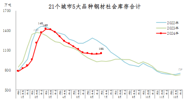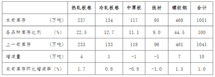 7月上旬,21個城市5大品種鋼材社會庫存1051萬噸,環(huán)比增加10萬噸,上升1.0%,庫存連續(xù)11旬下降后在本旬首次回升;比年初增加322萬噸,上升44.2%;比上年同期增加114萬噸,上升12.2%。