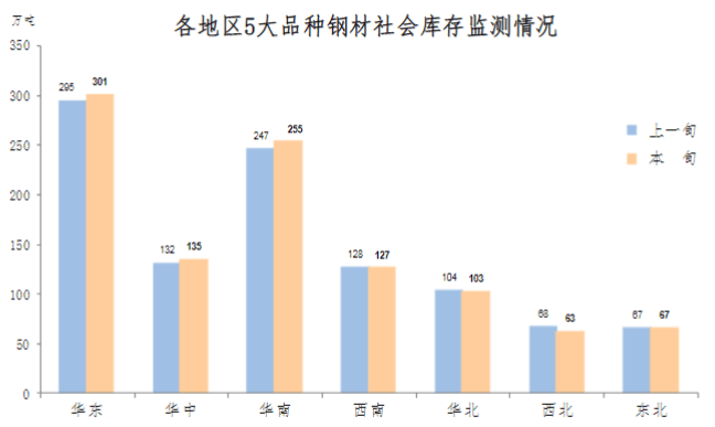 7月上旬,分地區(qū)來看,七大區(qū)域庫存環(huán)比各有升降,具體情況為:華南庫存環(huán)比增加8萬噸,上升3.2%,為增量和升幅最大地區(qū);華東增加6萬噸,上升2.0%;華中增加3萬噸,上升2.3%;西北庫存環(huán)比減少5萬噸,下降7.4%;華北和西南庫存均減少1萬噸,分別下降1.0%和0.8%;東北庫存環(huán)比持平。
