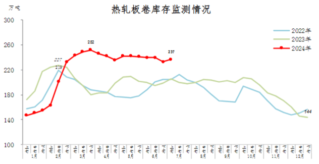 7月上旬,熱軋板卷庫存237萬噸,環(huán)比增加4萬噸,上升1.7%,庫存高位波動;比年初增加93萬噸,上升64.6%;比上年同期增加31萬噸,上升15.0%。