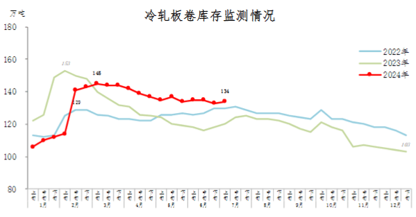 7月上旬,冷軋板卷庫存134萬噸,環(huán)比增加1萬噸,上升0.8%;比年初增加31萬噸,上升30.1%;比上年同期增加14萬噸,上升11.7%。