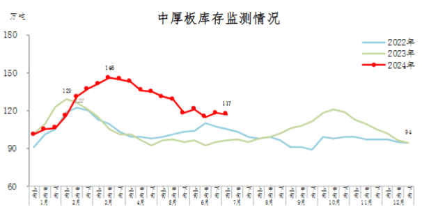 7月上旬,中厚板庫存117萬噸,環(huán)比減少1萬噸,下降0.8%,庫存小幅波動;比年初增加23萬噸,上升24.5%;比上年同期增加21萬噸,上升21.9%。