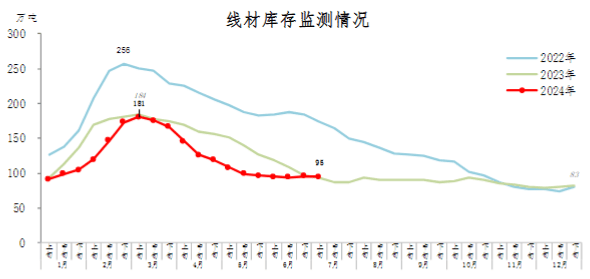 7月上旬,線材庫存95萬噸,環(huán)比減少1萬噸,下降1.0%,庫存保持較低水平;比年初增加12萬噸,上升14.5%;比上年同期增加2萬噸,上升2.2%。