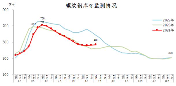 7月上旬,螺紋鋼庫存468萬噸,環(huán)比增加7萬噸,上升1.5%,庫存上升幅度擴大;比年初增加163萬噸,上升53.4%;比上年同期增加46萬噸,上升10.9%。