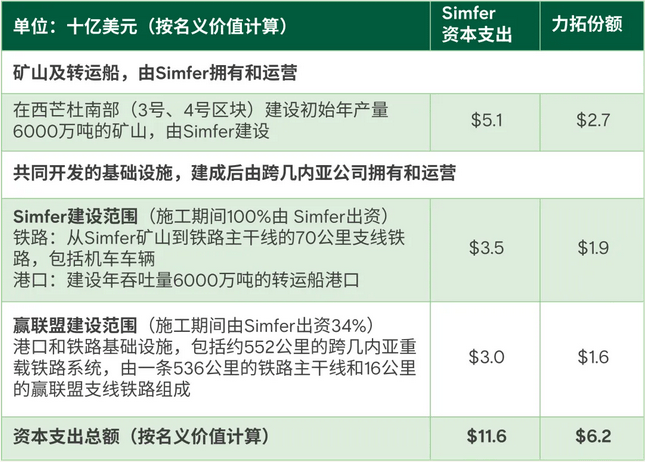 Simfer對西芒杜項(xiàng)目整體的資金需求約為116億美元,其中力拓集團(tuán)所承擔(dān)份額約為62億美元,具體如下: