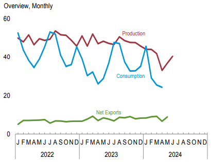 消費(fèi)方面,報(bào)告顯示,2024年4月份,美國煤炭總消費(fèi)量為2427.1萬短噸,同比下降6.75%,環(huán)比下降4.77%。