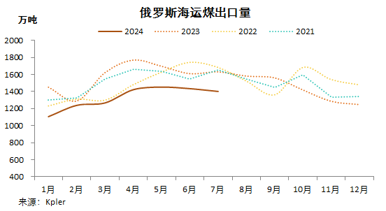 Kpler船舶追蹤數(shù)據(jù)顯示,2024年7月份,俄羅斯海運(yùn)煤出口量1401.35萬(wàn)噸,環(huán)比降2.28%,同比降14.08%。