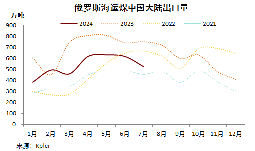 2024年1-7月份,俄羅斯海運(yùn)煤出口量累計(jì)9320.57萬(wàn)噸,同比降15.79%。今年以來,制裁、鐵路運(yùn)力低以及物流成本高等因素制約著俄羅斯煤炭的出口。