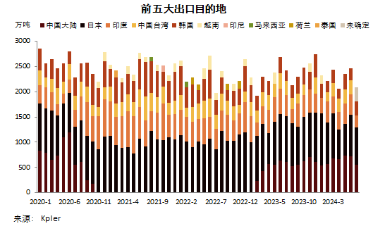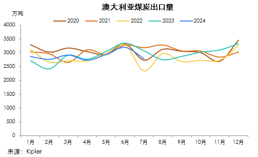 Kpler船舶追蹤數(shù)據(jù)顯示,2024年7月份,澳大利亞煤炭出口量2786.81萬噸,環(huán)比降12.82%,在連續(xù)兩個月增長后回落,同比降9.26%。
