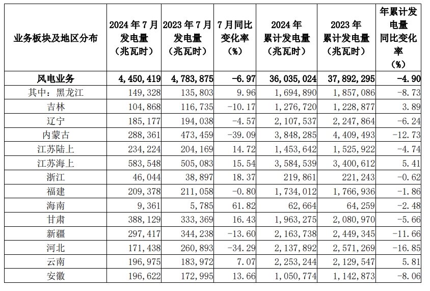 8月8日,龍源電力披露2024年7月發(fā)電量數(shù)據(jù)。龍源電力(以下簡稱“本公司”)2024 年 7 月按合并報表口徑完成發(fā)電量 6,177,783 兆瓦時,較 2023 年同期同比下降 2.31%。其中,風電發(fā)電量下降 6.97%,火電發(fā)電量下降 4.28%,其他可再生能源發(fā)電量增長42.24%。截至 2024 年 7 月 31 日,本公司 2024 年累計完成發(fā)電量 46,259,628 兆瓦時,較 2023 年同期同比增長 0.41%。其中,風電發(fā)電量下降 4.90%,火電發(fā)電量下降 2.70%,其他可再生能源發(fā)電量增長 102.50%。