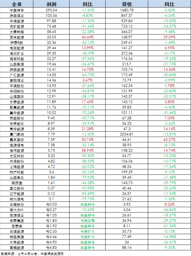 從凈利潤來看,36家企業(yè)實現(xiàn)盈利。其中,中國神華295.04億元第一,陜西煤業(yè)105.56億元第二,中煤能源97.88億元第三,兗礦能源75.68億元第四,大秦鐵路58.45億元第五。