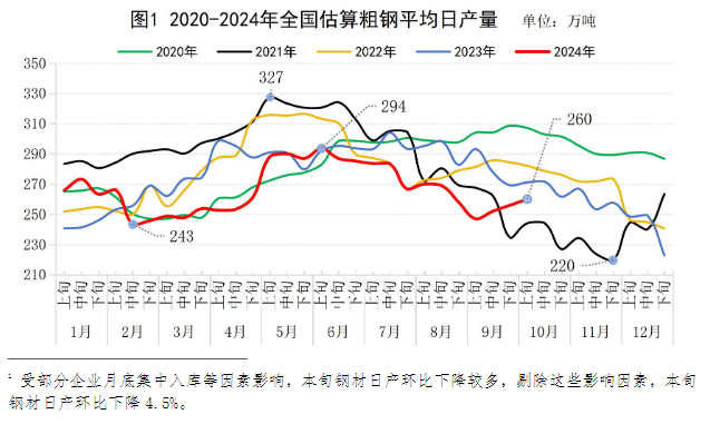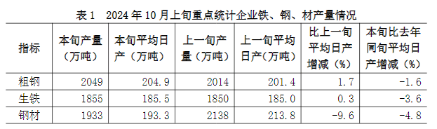 2024年10月上旬,重點(diǎn)統(tǒng)計(jì)鋼鐵企業(yè)共生產(chǎn)粗鋼2049萬(wàn)噸,平均日產(chǎn)204.9萬(wàn)噸,日產(chǎn)環(huán)比增長(zhǎng)1.7%;生鐵1855萬(wàn)噸,平均日產(chǎn)185.5萬(wàn)噸,日產(chǎn)環(huán)比增長(zhǎng)0.3%;鋼材1933萬(wàn)噸,平均日產(chǎn)193.3萬(wàn)噸,日產(chǎn)環(huán)比下降9.6%1(見(jiàn)表1)。