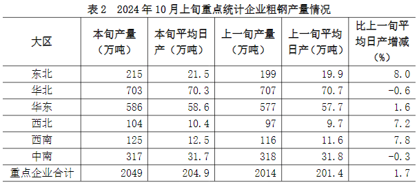 10月上旬六大地區(qū)中,除華北、中南地區(qū)重點(diǎn)統(tǒng)計(jì)企業(yè)粗鋼日產(chǎn)量較上一旬略有下降外,其它地區(qū)均有不同程度增長(zhǎng)(詳見(jiàn)表2),具體為: