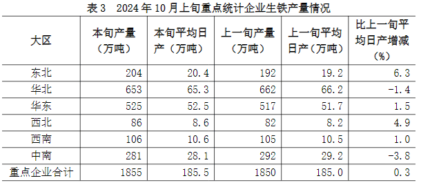 10月上旬六大地區(qū)中,除華北、中南地區(qū)重點(diǎn)統(tǒng)計(jì)企業(yè)生鐵日產(chǎn)量較上一旬下降外,其它地區(qū)均有不同程度增長(zhǎng)(詳見(jiàn)表3),具體為: