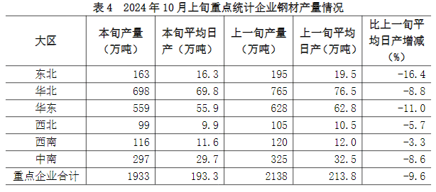 10月上旬,六大地區(qū)重點(diǎn)統(tǒng)計(jì)企業(yè)鋼材日產(chǎn)量較上一旬均有不同程度下降(詳見(jiàn)表4),具體為: