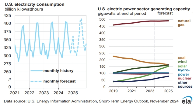 美國能源信息署(EIA)11月13日發(fā)布的最新《短期能源展望》報告顯示,2024和2025年,美國電力消費量預計將創(chuàng)歷史紀錄新高。