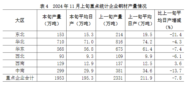 2024年11月上旬,重點(diǎn)統(tǒng)計(jì)鋼鐵企業(yè)共生產(chǎn)粗鋼2096萬噸,平均日產(chǎn)209.6萬噸,日產(chǎn)環(huán)比增長0.1%;生鐵1882萬噸,平均日產(chǎn)188.2萬噸,日產(chǎn)環(huán)比下降0.1%;鋼材1953萬噸,平均日產(chǎn)195.3萬噸,日產(chǎn)環(huán)比下降7.8%1(見表1)。