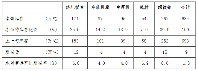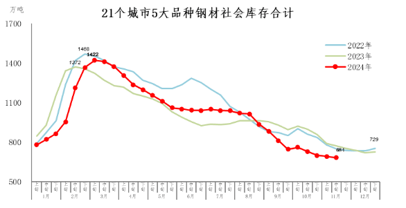 11月中旬,21個(gè)城市5大品種鋼材社會(huì)庫(kù)存684萬(wàn)噸,環(huán)比減少9萬(wàn)噸,下降1.3%,庫(kù)存繼續(xù)小幅下降;比年初減少45萬(wàn)噸,下降6.2%;比上年同期減少89萬(wàn)噸,下降11.5%。