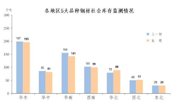 11月中旬,分地區(qū)來(lái)看,七大區(qū)域鋼材庫(kù)存環(huán)比各有升降,具體情況為:華南庫(kù)存環(huán)比減少13萬(wàn)噸,下降8.4%,為減量和減幅最大地區(qū);華北增加10萬(wàn)噸,上升12.8%,為增量和增幅最大地區(qū);華東減少2萬(wàn)噸,下降1.0%;華中減少4萬(wàn)噸,下降4.7%;西南減少2萬(wàn)噸,下降2.0%;東北環(huán)比持平;西北增加2萬(wàn)噸,上升4.1%。